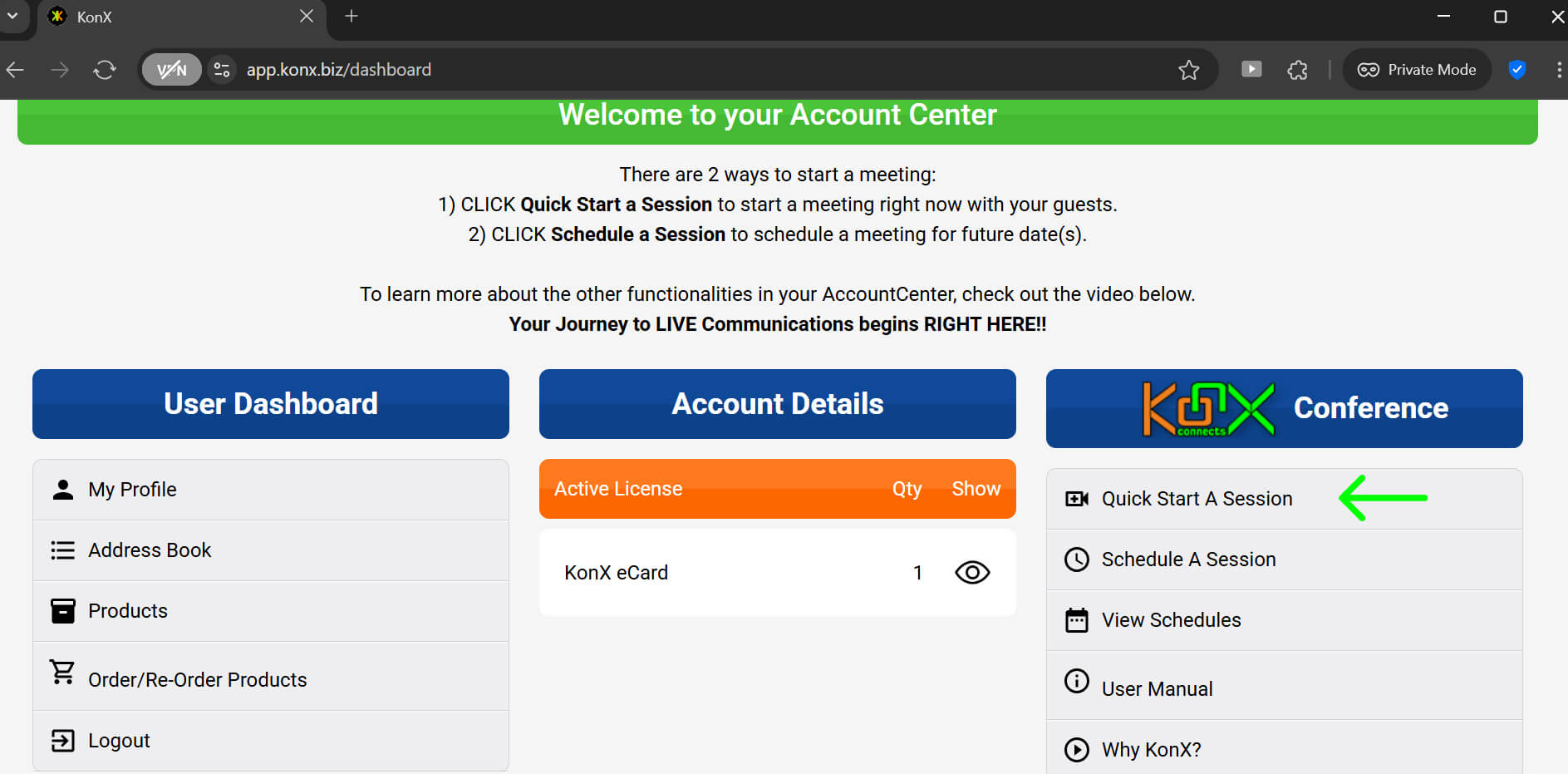 - Click the Access KonX button, or directly type app.konx.biz into your browser.