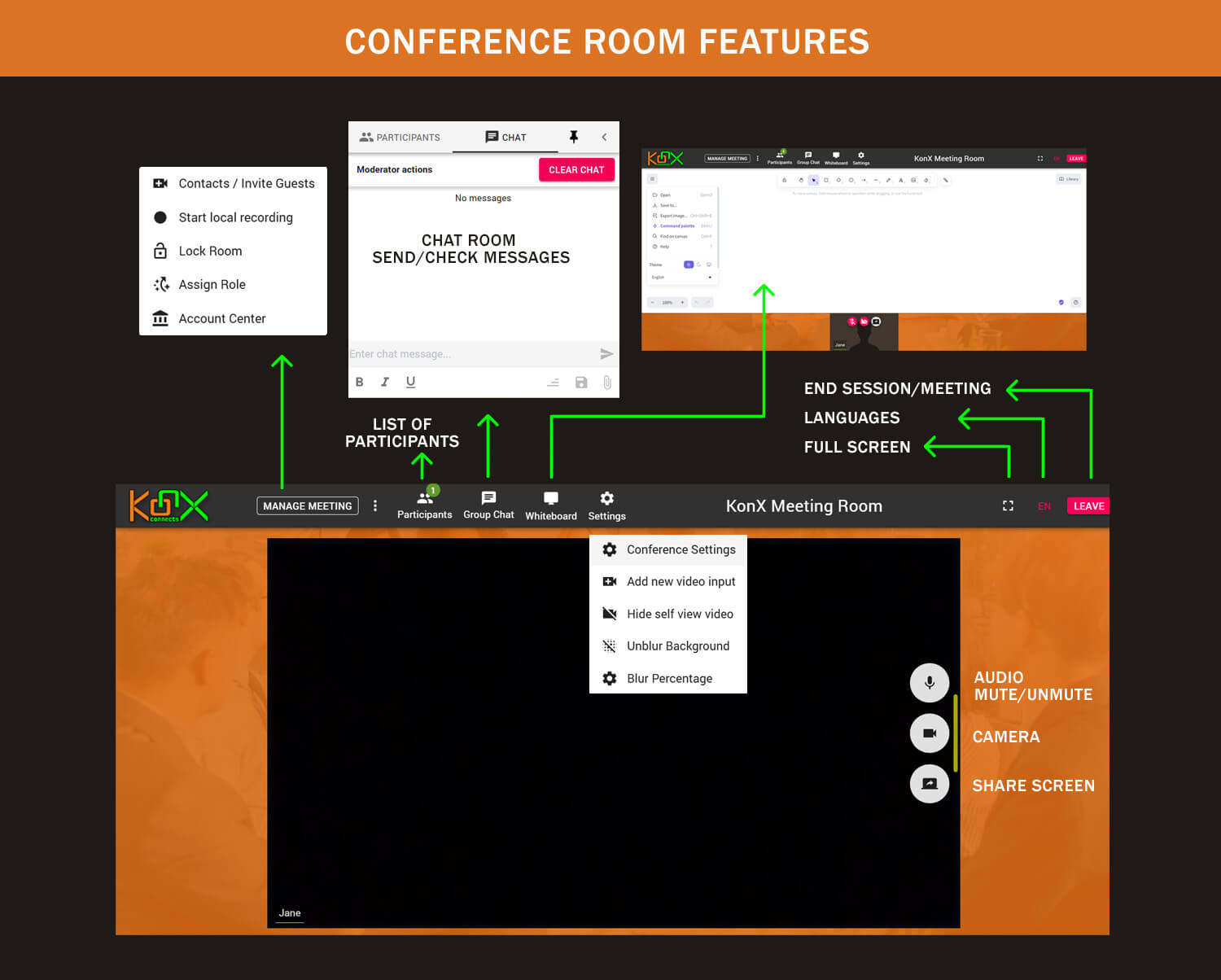 - Moderator: Can remove users, stop audio/video, and manage screen sharing.
